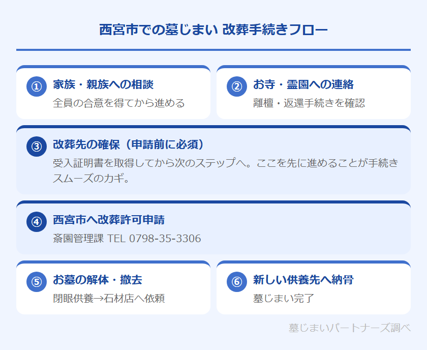 改葬先を先に決めておくことが重要です。西宮市への改葬許可申請には、新しい供養先が発行する「受入証明書または使用許可書」が必要になります。供養先が決まっていない状態では申請を進めることができませんので、この順番を守ることが手続きをスムーズに進めるポイントです。
