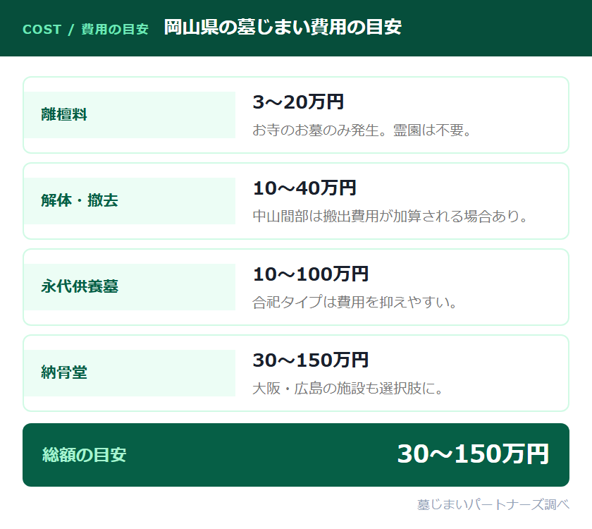 - 永代供養墓:10〜100万円程度。合祀か個別かで費用差が大きく、岡山市・倉敷市の施設から大阪・広島の施設まで選択肢があります。