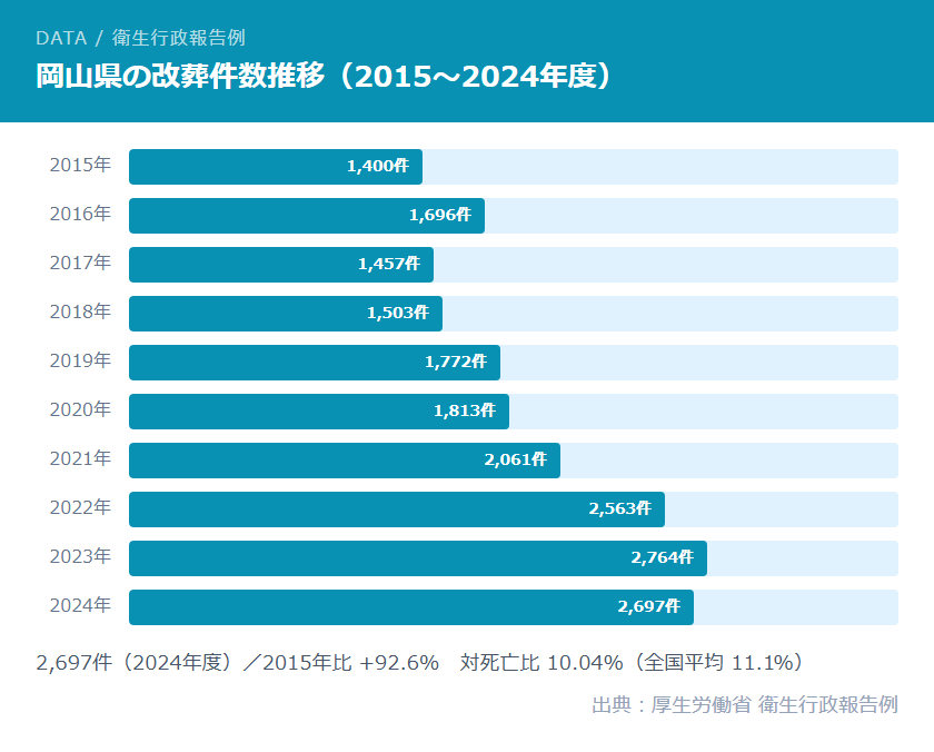 岡山県の改葬件数は2015年度の1,400件から2023年度の2,764件(対死亡比10.45%)へと、この10年で約93%増加しました。2024年度の2,697件(対死亡比10.04%)は全国平均(11.1%)とほぼ同水準に達しており、改葬が身近な選択肢として定着しつつあります。