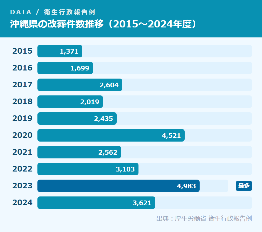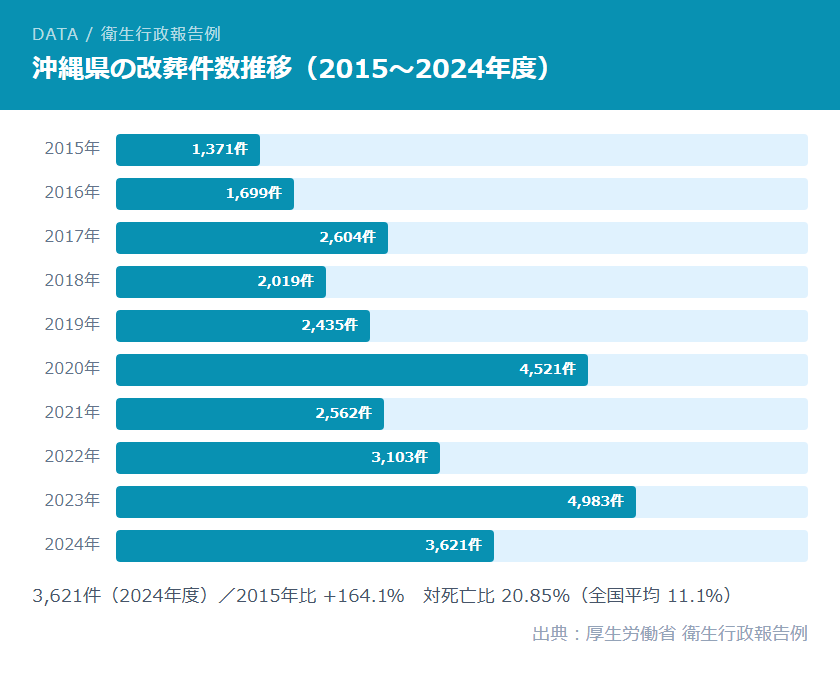沖縄県では、墓じまい(改葬)の件数が近年急増しています。厚生労働省の衛生行政報告例によると、2023年度の改葬件数は4,983件と統計史上最多を記録し、死亡件数に対する改葬件数の割合(対死亡比)は30.96%と全国平均11.1%の約2.8倍に達しました。2020年度にも4,521件・対死亡比33.32%という突出した水準を記録しており、沖縄県では近年、墓じまいが急速に進んでいます。