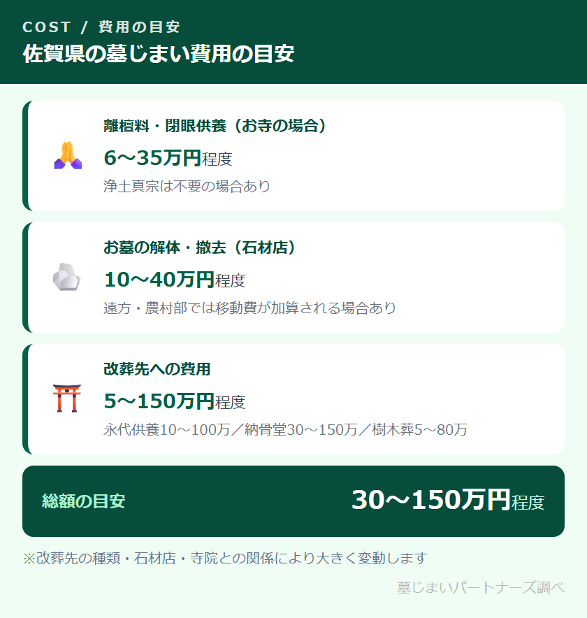 佐賀県での墓じまいにかかる費用は、離檀料・閉眼供養のお布施・お墓の解体撤去・改葬先への費用を合計すると、総額30〜150万円程度が目安です。改葬先の選び方や石材店の選定によって大きく差が出るため、複数の業者から見積もりを取ることが大切です。