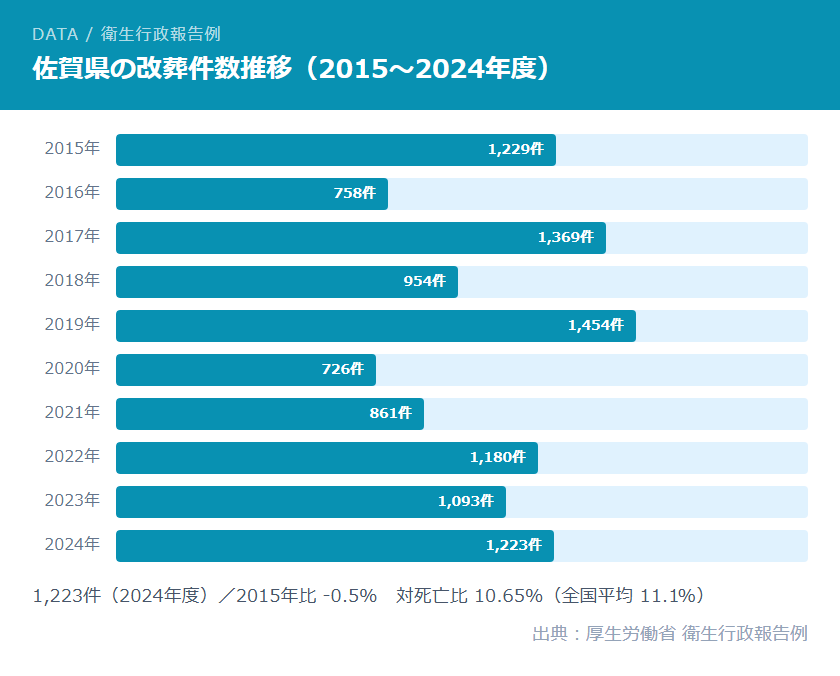 佐賀県の改葬件数は年によって変動が大きく、2015年の1,229件、2019年に1,454件(最多)、2020年のコロナ禍で726件まで急減したのち2022年は1,180件と回復しました。2024年は1,223件(対死亡比10.65%)と2022年の水準に近い件数を維持しています。全国平均(11.1%)にほぼ並ぶ水準であり、佐賀県での墓じまいは着実に増加しています。