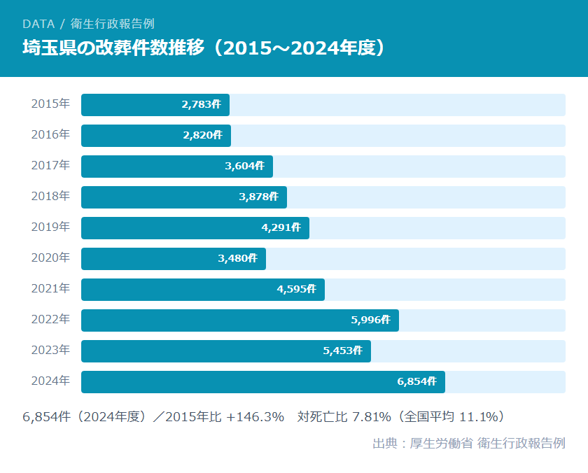 2024年の対死亡比(その年の死亡件数に対する改葬件数の割合)は7.81%で、全国平均の11.1%よりまだ低い水準です。これは、埼玉県での墓じまいはまだ初期段階にあり、今後さらに増加する余地が大きいことを示しています。