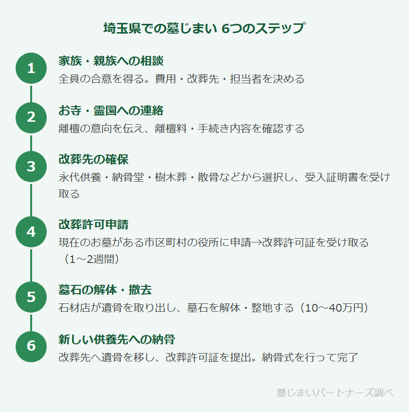 埼玉県での墓じまいを進める手順をまとめると、①家族・親族への相談 → ②お寺・霊園への連絡 → ③改葬先の確保 → ④改葬許可申請(各市区町村の役所へ) → ⑤墓石の解体・撤去 → ⑥新しい供養先への納骨、という流れになります。費用の総額目安は30万円〜150万円程度で、2026年時点で公的な補助金はありません。