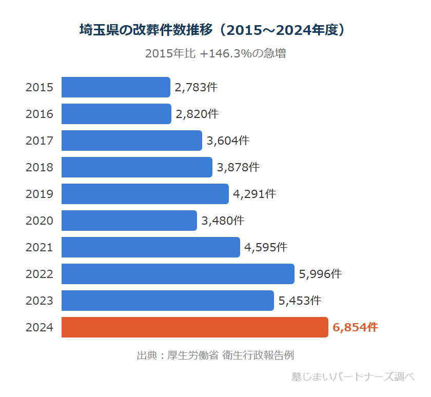 埼玉県では、2015年に2,783件だった改葬件数が2024年には6,854件へと、わずか9年で約2.5倍(+146.3%)に増加しています。東京のベッドタウンとして全国的に見ても珍しい人口増加県でありながら、墓じまいの件数だけは急速に伸び続けているのが埼玉県の特徴です。