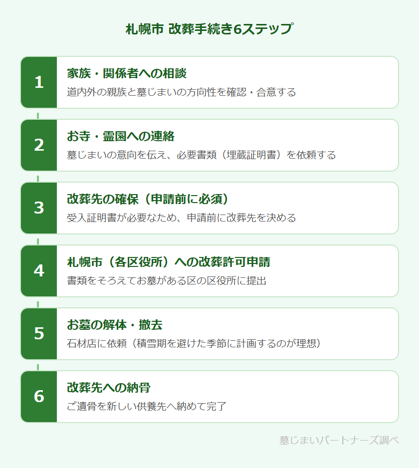 墓じまいは「①家族・親族への相談→②お寺・霊園への連絡→③改葬先の確保→④改葬許可申請→⑤お墓の解体・撤去→⑥新しい供養先への納骨」という6つのステップで進みます。札幌市では冬季の工事が制限される場合もあるため、スケジュールの計画が特に大切です。