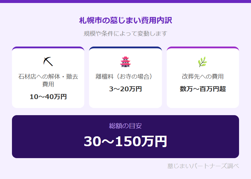 墓じまいにかかる費用は、大きく「①離檀料(お寺のお墓の場合)」「②石材店への解体・撤去費用」「③改葬先への費用」の3つに分かれます。北海道・札幌市ならではの事情も含めて確認しておきましょう。