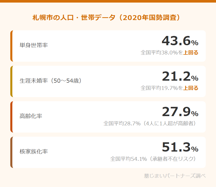 2020年の国勢調査によると、札幌市の単身世帯率は43.6%(全国平均38.0%)で、全国平均を大きく上回っています。全世帯の4割以上が一人暮らしという状況で、「後継者がいない」「将来お墓を管理できる家族がいない」という方が非常に多い都市です。