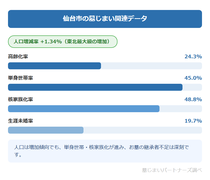 仙台市の人口は2015年から2020年にかけて1.34%増加しており(全国平均は0.75%の減少)、東北の拠点都市として人口流入が続いています。一方で核家族化が進み、核家族化率は48.8%(全国平均54.1%)と全国よりやや低めですが、地縁・血縁のネットワークが弱まる中で、「お墓の管理を担える家族がいない」という現実は年々身近になっています。