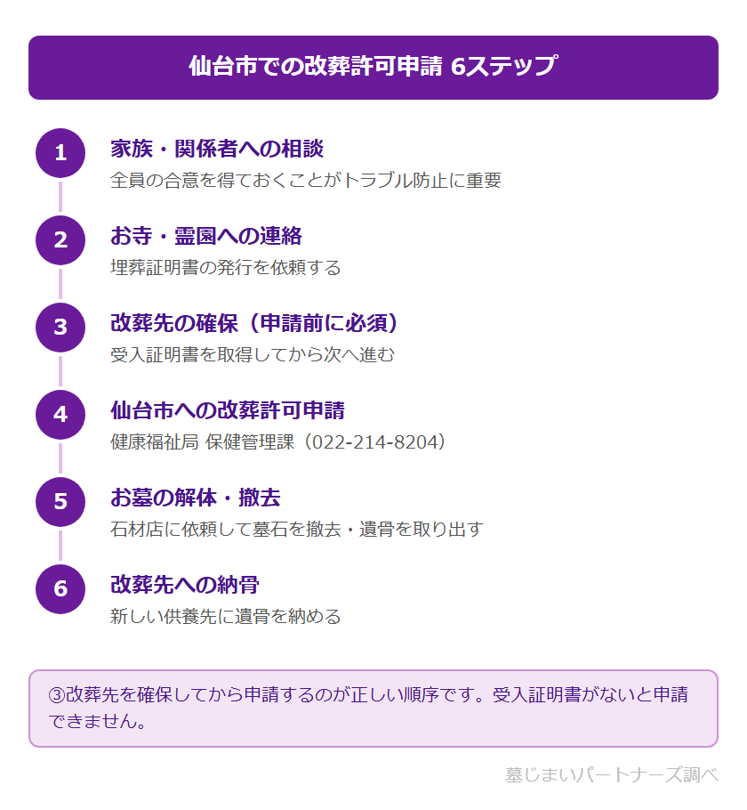 改葬先を先に決めておくことが重要です。仙台市への改葬許可申請には、新しい供養先が発行する「受入証明書または使用許可書」が必要になります。供養先が決まっていない状態では申請を進めることができませんので、この順番を守ることが手続きをスムーズに進めるポイントです。