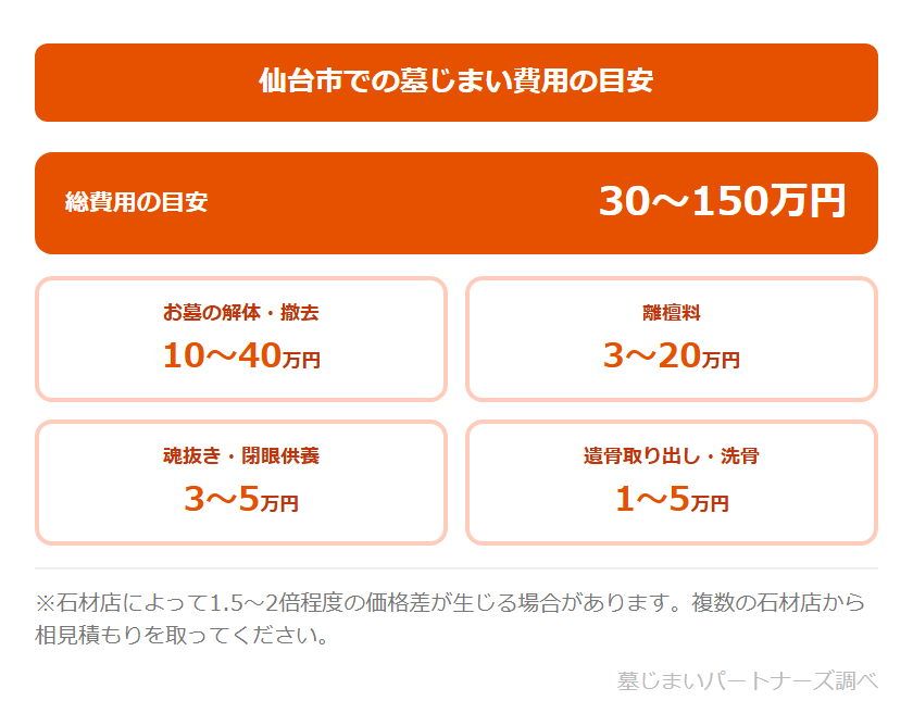 離檀料・石材店への解体費用・改葬先への費用を合わせると、30〜150万円程度になるケースが多いです。お寺のお墓か霊園かによって費用構成が異なります。複数の石材店から相見積もりを取ることで費用を抑えられる場合もあります。
