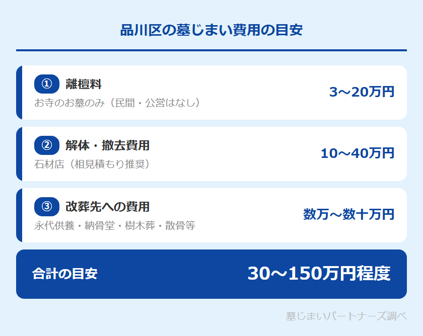 墓じまいにかかる費用は、大きく「①離檀料」「②石材店への解体・撤去費用」「③改葬先への費用」の3つに分かれます。それぞれの目安と、東京都内ならではの注意点を確認しておきましょう。