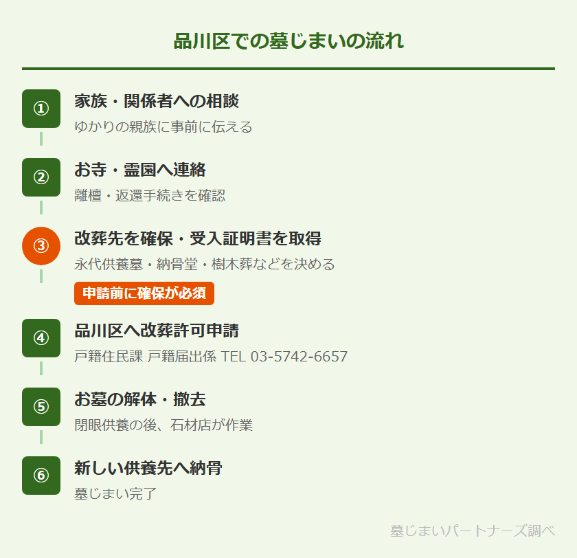 改葬先を先に決めておくことが重要です。品川区への改葬許可申請には、新しい供養先が発行する「受入証明書または使用許可書」が必要になります。供養先が決まっていない状態では申請を進めることができませんので、この順番を守ることが手続きをスムーズに進めるポイントです。