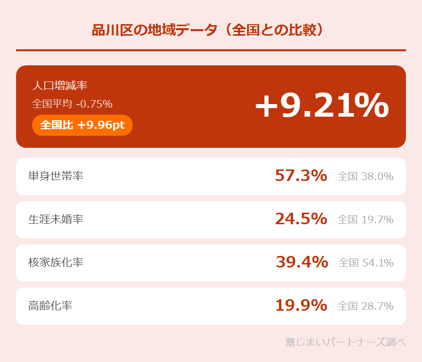 - 人口増加率+9.21%・単身世帯率57.3%と、転入単身世帯が多い品川区では「遠方のお墓の管理」「後継者不在」の問題が身近です。早めの検討が将来の安心につながります。