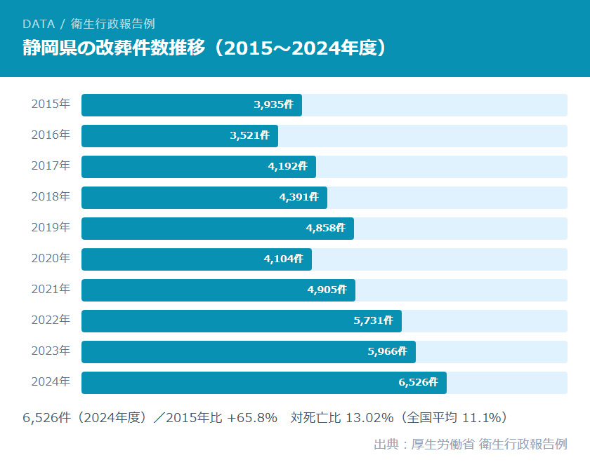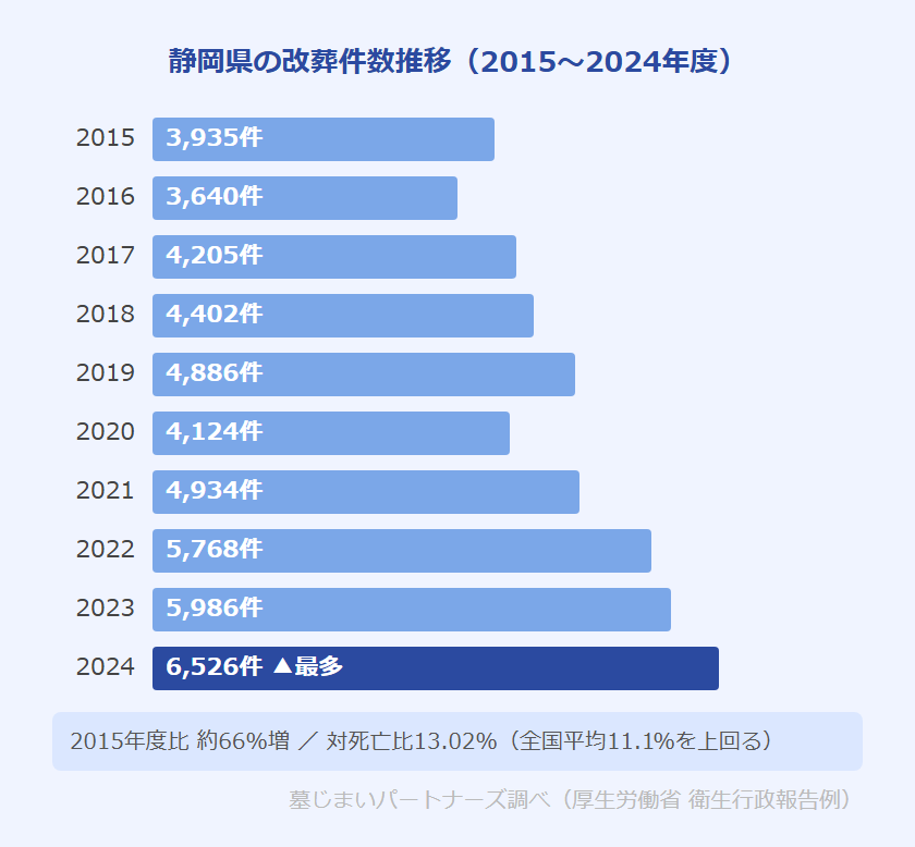 静岡県の改葬件数は、2015年度の3,935件から2024年度の6,526件へと増加しました。2024年度が最多を記録しており、特に2022年度以降は急速に増加しています。対死亡比13.02%(2024年度)は全国平均(11.1%)を上回っており、静岡県は全国的に見ても墓じまいが活発な県となっています。