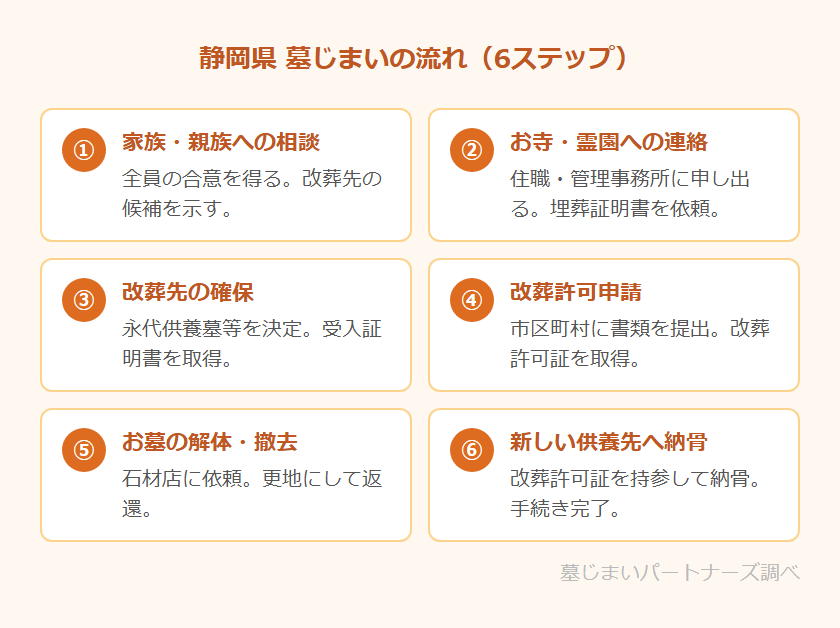 墓じまいは、家族・お寺・役所・石材店・改葬先の複数の関係者との調整が必要な手続きです。静岡県での一般的な流れを6つのステップで確認しましょう。詳しい手続き全体については墓じまいの流れを8ステップで解説もご参照ください。