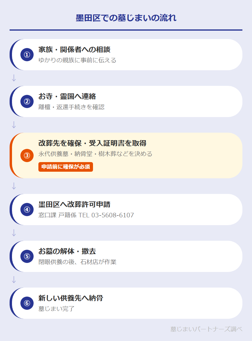墨田区の窓口課 戸籍係(TEL: 03-5608-6107)が申請窓口です。申請前に改葬先の確保と受入証明書の取得が必要です。詳細は墨田区公式サイトでご確認ください。書類不備を防ぐために事前に電話確認することをおすすめします。