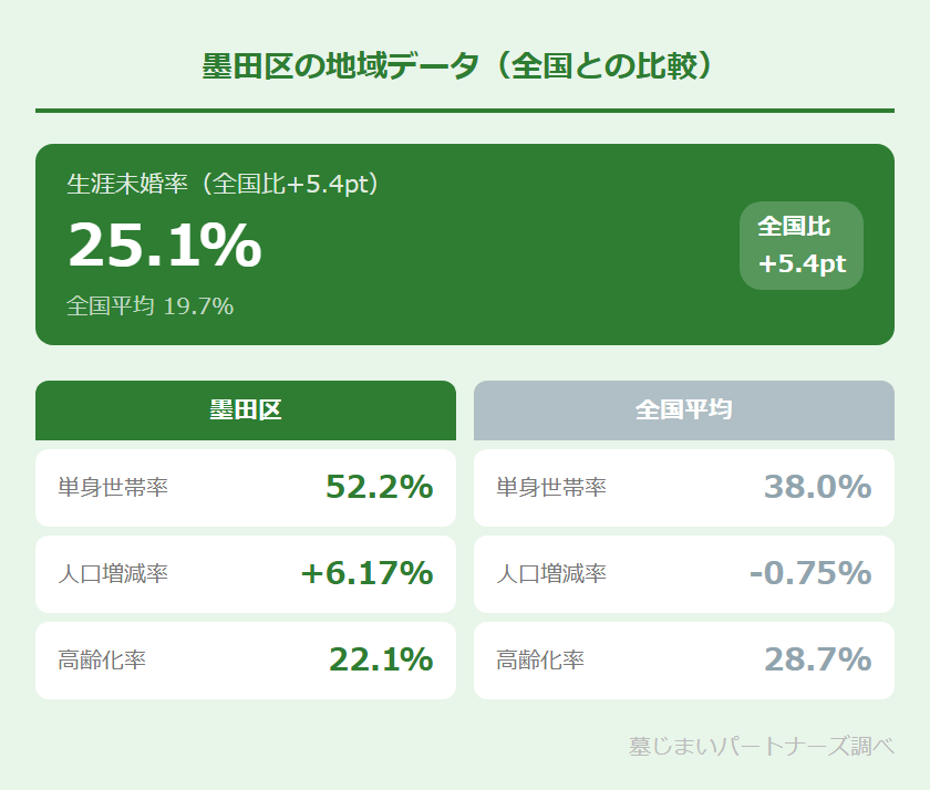 - 単身世帯率52.2%・生涯未婚率25.1%という墨田区の実情から、承継者不在の問題は身近です。早めの検討が将来の安心につながります。