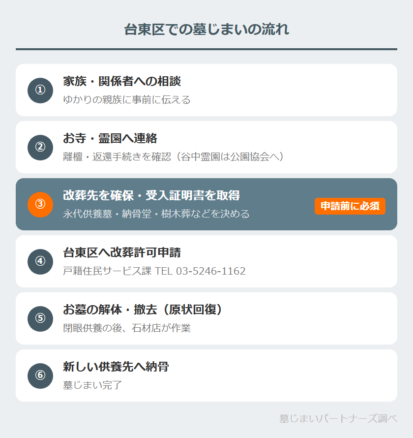 改葬先を先に決めておくことが重要です。台東区への改葬許可申請には、新しい供養先が発行する「受入証明書または使用許可書」が必要になります。供養先が決まっていない状態では申請を進めることができませんので、この順番を守ることが手続きをスムーズに進めるポイントです。