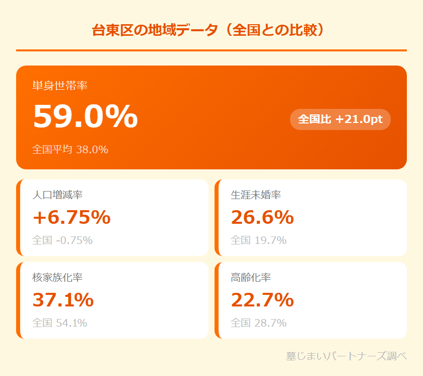 2020年の国勢調査によると、台東区の単身世帯率は59.0%(全国平均38.0%、差+21.0pt)。実に全世帯の約6割が一人暮らしです。生涯未婚率は26.6%(全国平均19.7%)と高く、4人に1人以上が未婚のまま50代を迎えている計算になります。核家族化率は37.1%(全国54.1%)と全国より大幅に低く、単身世帯の多さを反映しています。