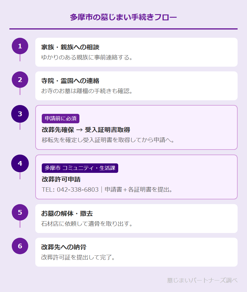 多摩市のコミュニティ・生活課(TEL: 042-338-6803)で受け付けています。申請前に改葬先の確保と受入証明書の取得が必要です。詳細は多摩市公式サイトでご確認ください。