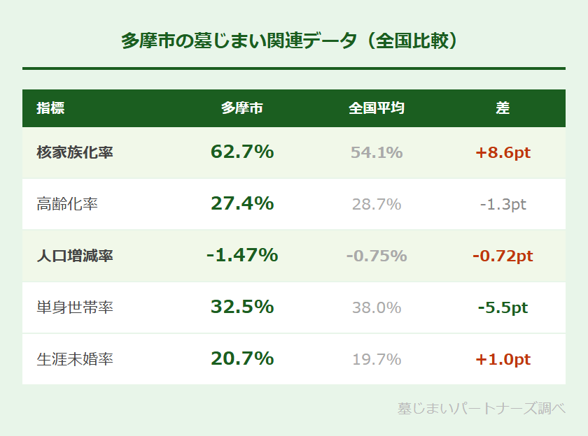 多摩市は多摩ニュータウンの中心都市として発展した住宅都市です。核家族化率62.7%(全国平均54.1%より+8.6pt)が際立って高く、人口増減率-1.47%(全国比-0.72pt)と人口流出も続いています。高度成長期に同時期に入居した世帯が同時に高齢化するという「ニュータウン型の高齢化」が顕著で、核家族世帯の高齢化とお墓の継承問題が一気に表面化しやすい地域です。