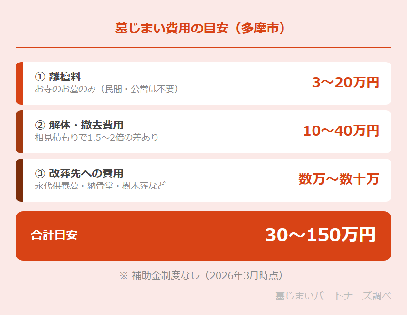 2026年3月時点で、多摩市には墓じまい(改葬)に関する補助金制度はありません。費用は自己負担となります。費用を抑えるには石材店の相見積もりや、費用を抑えやすい供養先の選択が有効です。