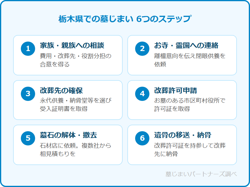 墓じまいは「お墓を撤去するだけ」ではなく、複数のステップを順番に進める必要があります。特に栃木県の農村部にある菩提寺のお墓では、お寺との関係を丁寧に整理しながら進めることが重要です。ここでは栃木県での墓じまいの一般的な流れを6つのステップに分けて解説します。