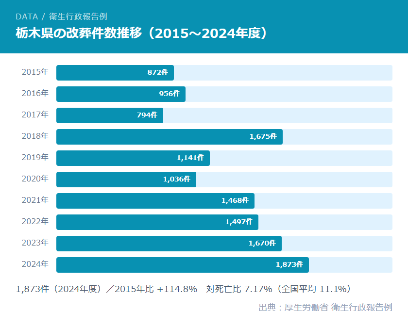 栃木県の改葬件数は2015年度の872件から2024年度の1,873件へと、約10年間で114.8%増加しました。特に2018年度には1,675件と急増し、注目を集めました。その後は一時落ち着きましたが、2022年(1,497件)・2023年(1,670件)・2024年(1,873件)と再び増加傾向に転じており、過去最高を更新し続けています。