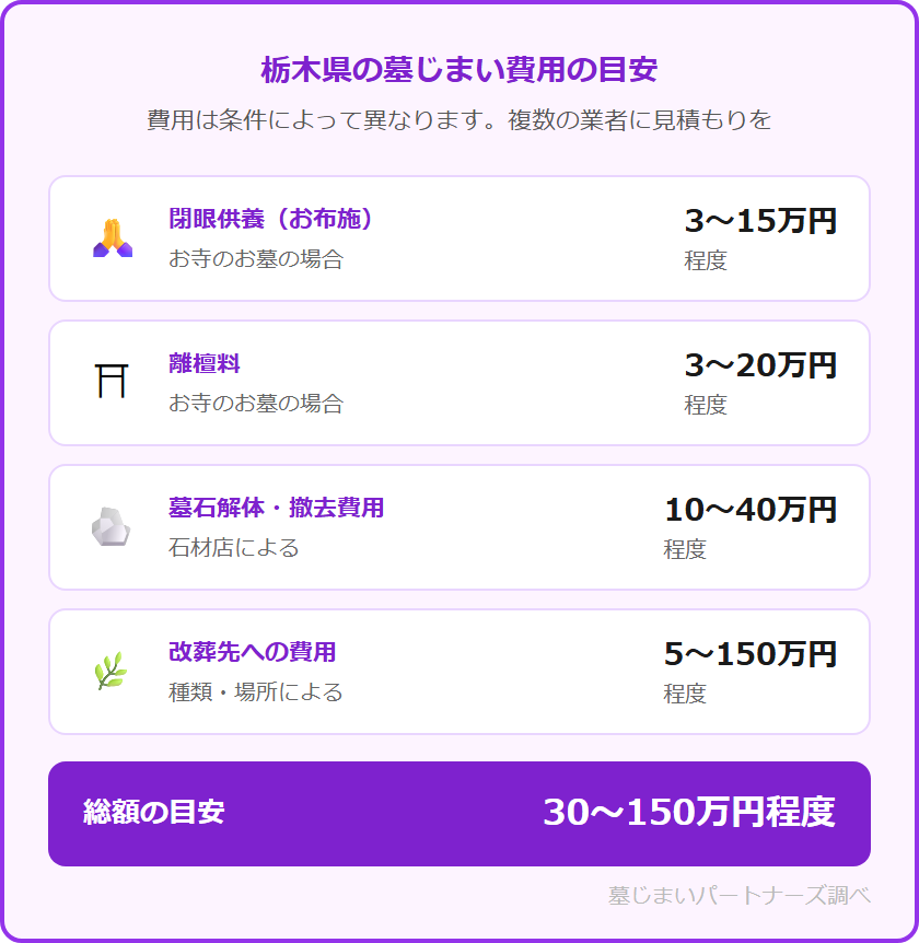 お寺のお墓を墓じまいする際は、閉眼供養(魂抜き)のお布施として3〜15万円程度、さらに離檀料として3〜20万円程度が必要になる場合があります。離檀料は法的に定められた金額ではなく、お寺や地域によって異なります。栃木県内のお寺でも差があるため、事前にお寺に確認しておきましょう。