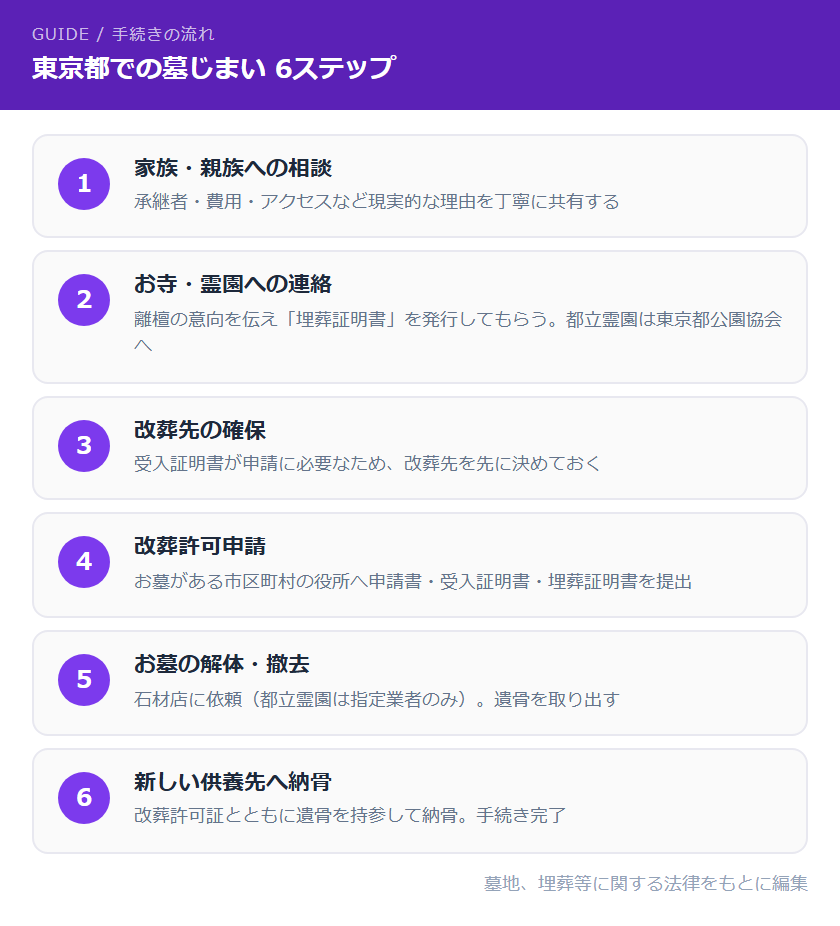 東京都でのお墓の墓じまいは、以下の6つのステップで進めます。改葬許可申請はお墓がある市区町村の役所に提出します。