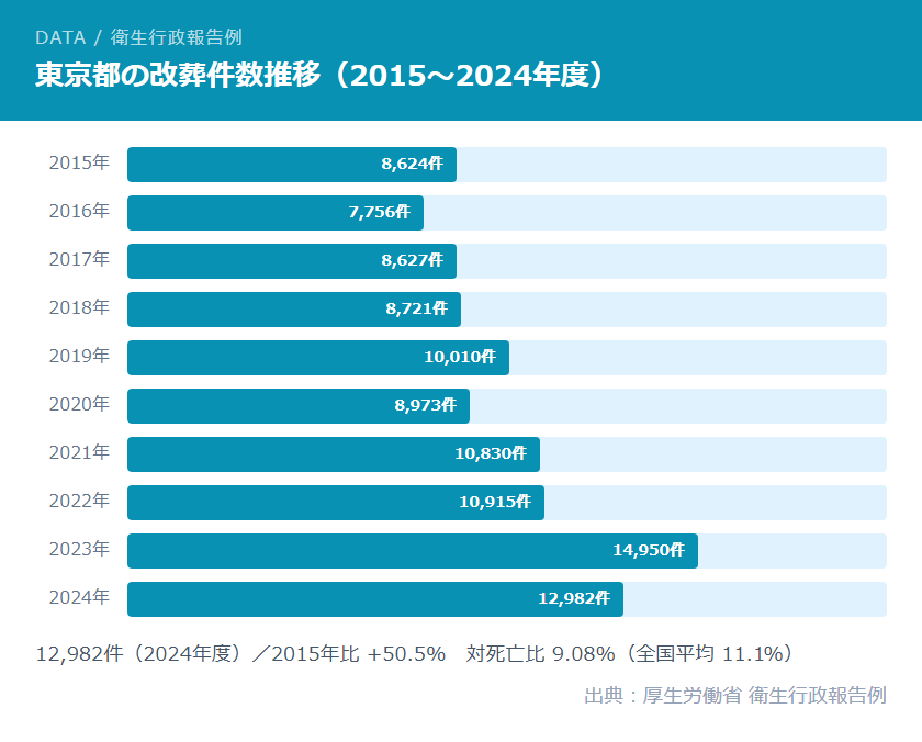 - 改葬件数は全国最多:2024年度12,982件、2015年から約1.5倍に増加