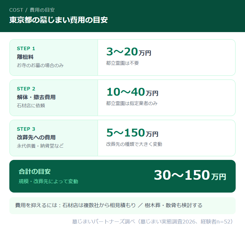 一般的な目安は30〜150万円です。内訳は、お寺のお墓の場合の離檀料(3〜20万円)、石材店への解体・撤去費(10〜40万円)、改葬先の費用(5〜150万円)です。都立霊園の場合は離檀料は不要ですが、指定石材業者への依頼が必要です。費用を抑えるためには、複数の石材店から相見積もりを取ることが重要です。