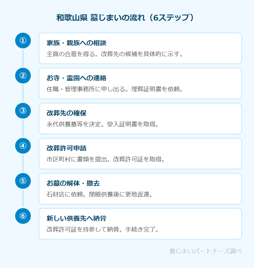 墓じまいは、家族・お寺・役所・石材店・改葬先の複数の関係者との調整が必要な手続きです。和歌山県では南部山間地域のお墓が多く、交通アクセスが限られる地域では各手続きに余裕を持ったスケジュールが特に重要です。全体の流れを6つのステップで確認しましょう。詳しい手続き全体については墓じまいの流れを8ステップで解説もご参照ください。