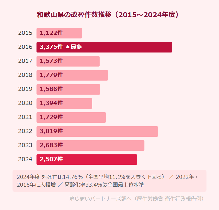 和歌山県では、2024年度の改葬件数が2,507件に達し、2015年度(1,122件)から約123%増加しています。2024年度の対死亡比は14.76%で、全国平均(11.1%)を3.66ポイント上回っており、全国平均を大きく超える水準で墓じまいが進んでいます。高齢化率33.4%(全国28.7%)・人口増減率-4.25%(全国-0.75%)と、全国でも際立って高齢化・人口減少が深刻な県のひとつです。