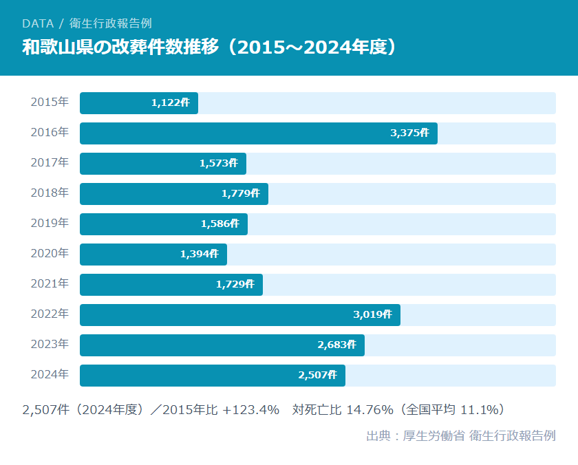 和歌山県の改葬統計では2016年度(3,375件)が突出しており、2022年度(3,019件)も急増が見られます。こうした年度ごとの変動は、大規模な霊園の整理・統廃合、公営墓地からの移転促進施策、あるいは特定の年度に改葬が集中した影響など複数の要因が考えられます。ただし全体の傾向としては2015年以降で改葬件数は増加しており、対死亡比14.76%(2024年)は全国平均(11.1%)を大きく上回っています。