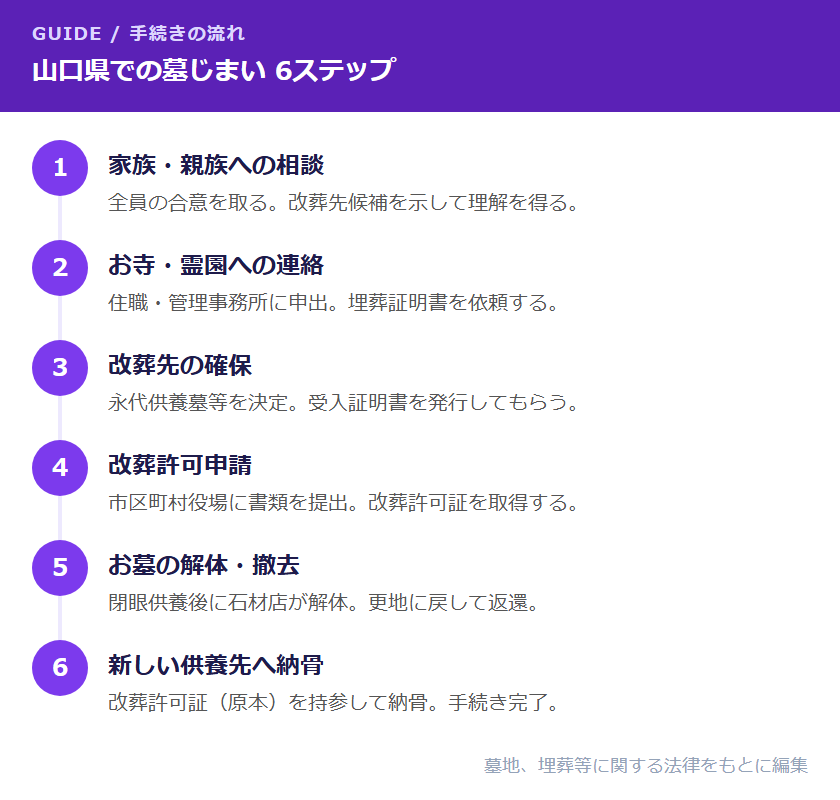 山口県での墓じまいは、法律上の手続き(改葬許可)と実際の作業(お墓の解体)を組み合わせて進めていきます。全体の流れは6つのステップに整理できます。お寺のお墓(寺院墓地)か公営・民間霊園かによって必要な手続きが一部異なりますが、改葬許可を取得するという流れは共通です。