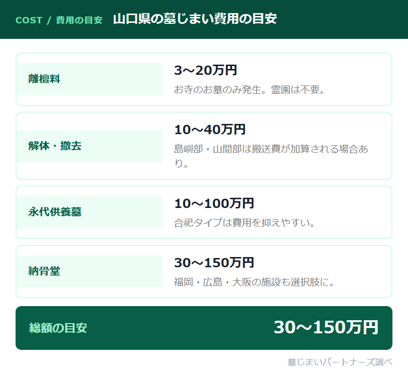 墓じまいにかかる費用は、お墓の種類・規模・改葬先の選択によって大きく異なります。山口県での墓じまい費用の総額は、おおむね30〜150万円程度が目安となります。以下に各費用項目の内訳を解説します。費用の詳しい解説は墓じまい費用の相場もご覧ください。