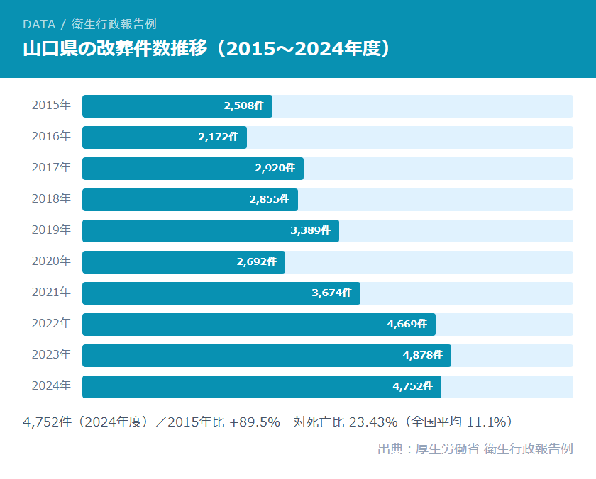 山口県では、2023年度の改葬件数が4,878件と過去最多を記録しました。死亡者数に対する改葬件数の割合(対死亡比)は24.57%に達しており、全国平均11.1%の約2.2倍という突出した水準にあります。高齢化率34.8%・人口減少率-4.46%という厳しい人口構造を背景に、後継者不在や遠方居住による管理困難を理由とした墓じまいが急増しています。