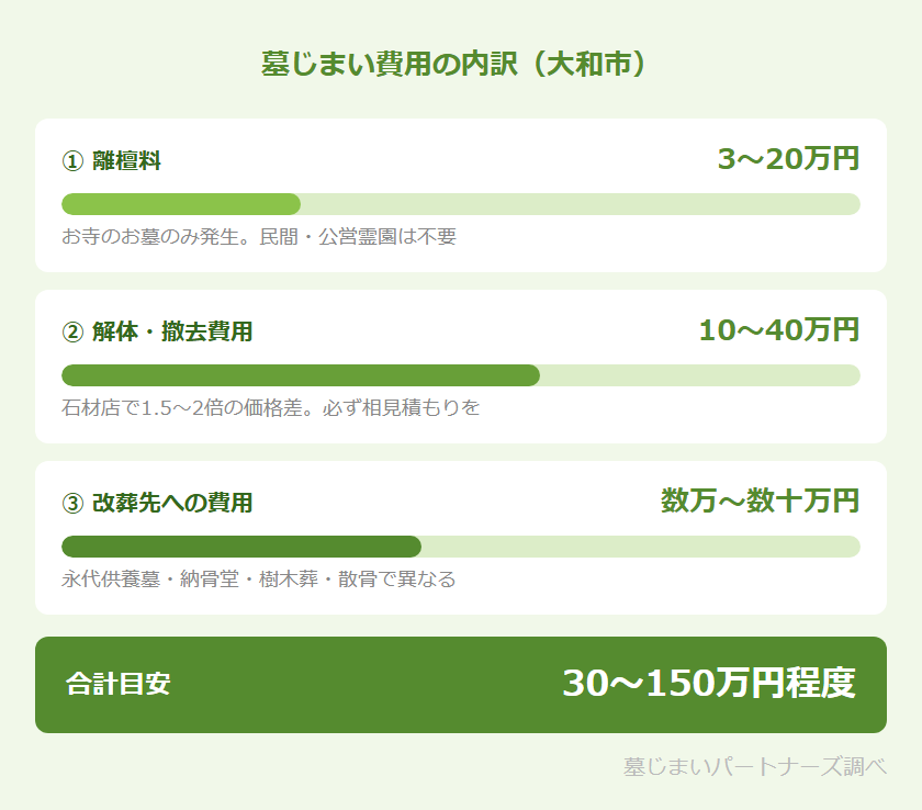 離檀料・石材店への解体費用・改葬先への費用を合わせると、30〜150万円程度になるケースが多いです。複数の石材店から相見積もりを取ることで費用を抑えられる場合もあります。