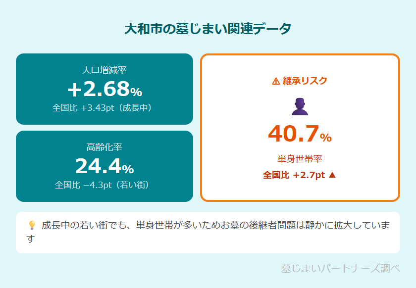- 単身世帯率40.7%(全国38.0%より+2.7pt)と転入者が多い成長都市・大和市では、「後継者がいない」「実家のお墓が遠方にある」という問題が特に身近です。早めの検討が将来の安心につながります。