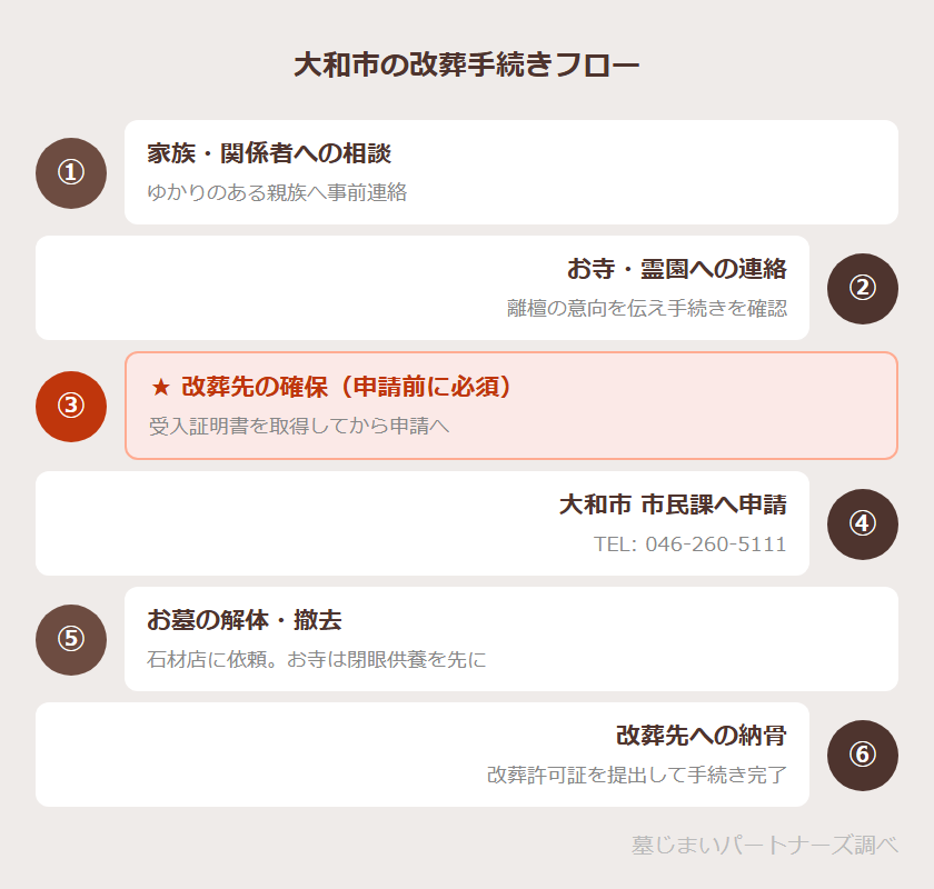 改葬先を先に決めておくことが重要です。大和市への改葬許可申請には、新しい供養先が発行する「受入証明書または使用許可書」が必要になります。供養先が決まっていない状態では申請を進めることができませんので、この順番を守ることが手続きをスムーズに進めるポイントです。