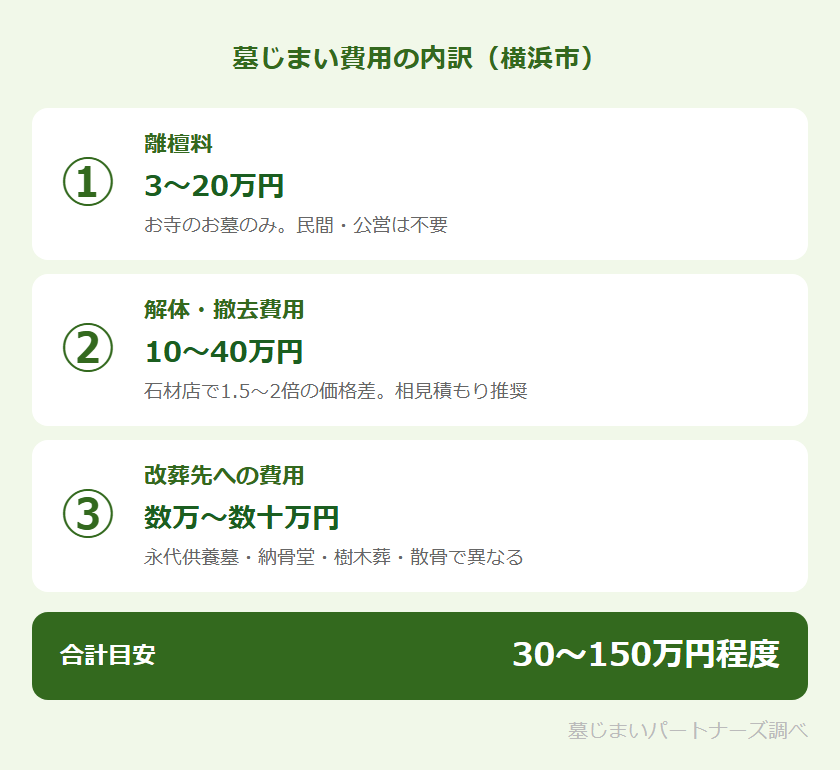 墓じまいにかかる費用は、大きく「①離檀料」「②石材店への解体・撤去費用」「③改葬先への費用」の3つに分かれます。それぞれの目安と、横浜市内ならではの注意点を確認しておきましょう。