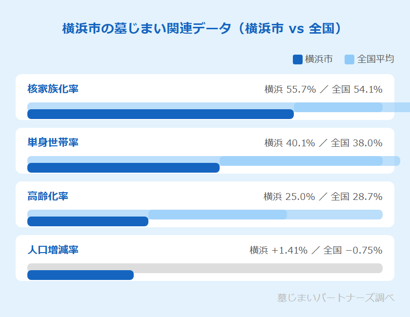 横浜市の人口増減率は+1.41%と全国平均(-0.75%)と比べて増加傾向にあります。活気ある都市である一方、高齢化率は25.0%(全国平均28.7%よりやや低め)で、高齢層を中心に「元気なうちに自分の代で整理しておきたい」という生前からの墓じまい需要が生まれています。生涯未婚率は19.2%と全国平均(19.7%)とほぼ同水準であり、後継者問題は決して他人事ではありません。