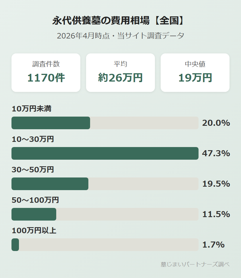 当サイトの調査データでは、全国の永代供養墓の平均費用は約26万円、中央値は約19万円です。
