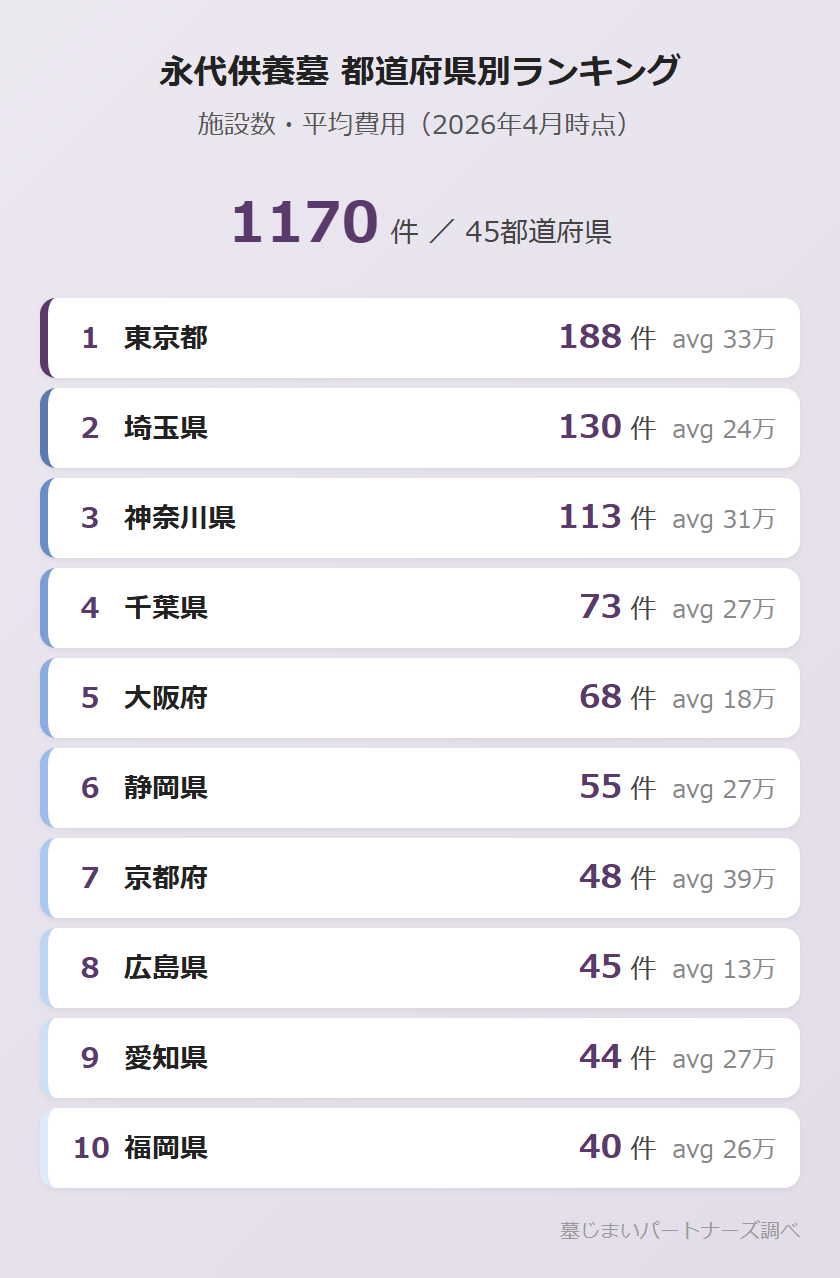 永代供養墓の費用や施設数は地域によって大きく異なります。ここでは、2026年4月時点の当サイト調査データをもとに、都道府県別の傾向を紹介します。