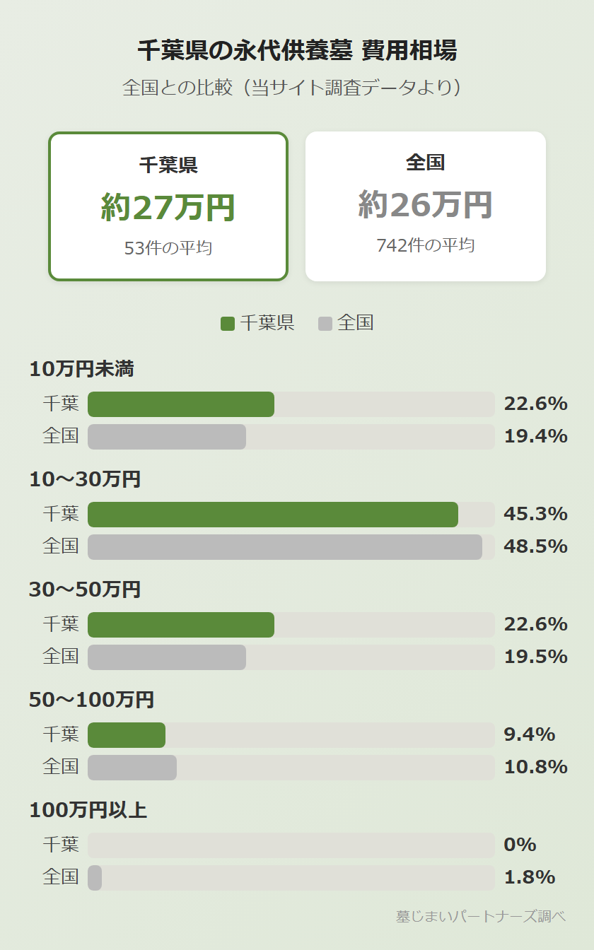 千葉県の永代供養墓の平均費用は約27万円で、全国平均の約26万円とほぼ同水準です。中央値は20万円。