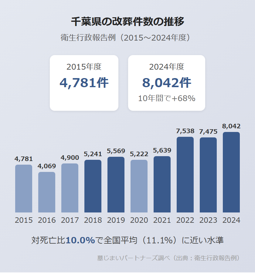 衛生行政報告例によると、千葉県の改葬件数は2015年度の4,781件から2024年度には8,042件へと、約10年間で68%増加しています。