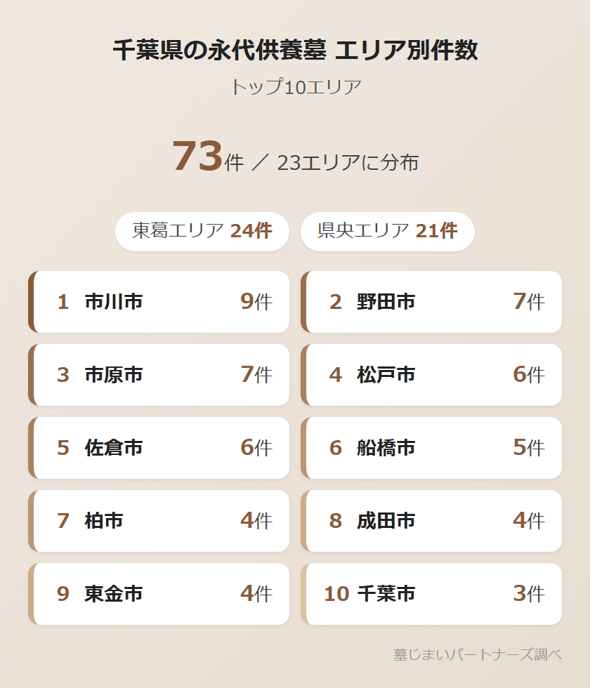 千葉県内の永代供養墓73件は、23のエリアに広がっています。
