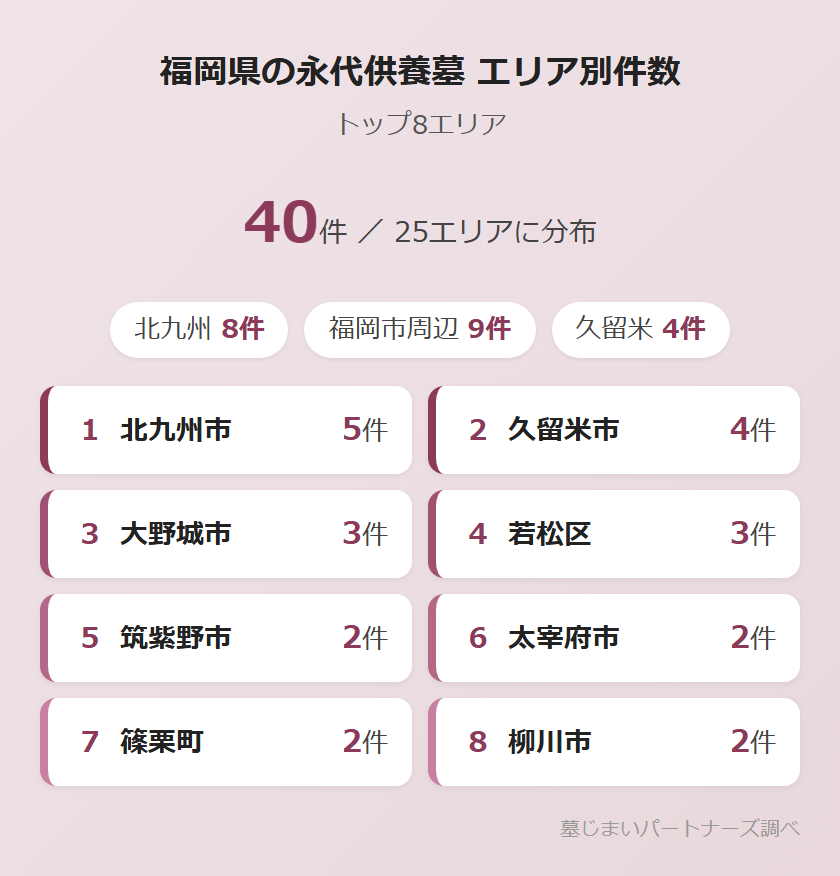 福岡県内の永代供養墓40件は、25のエリアに広がっています。